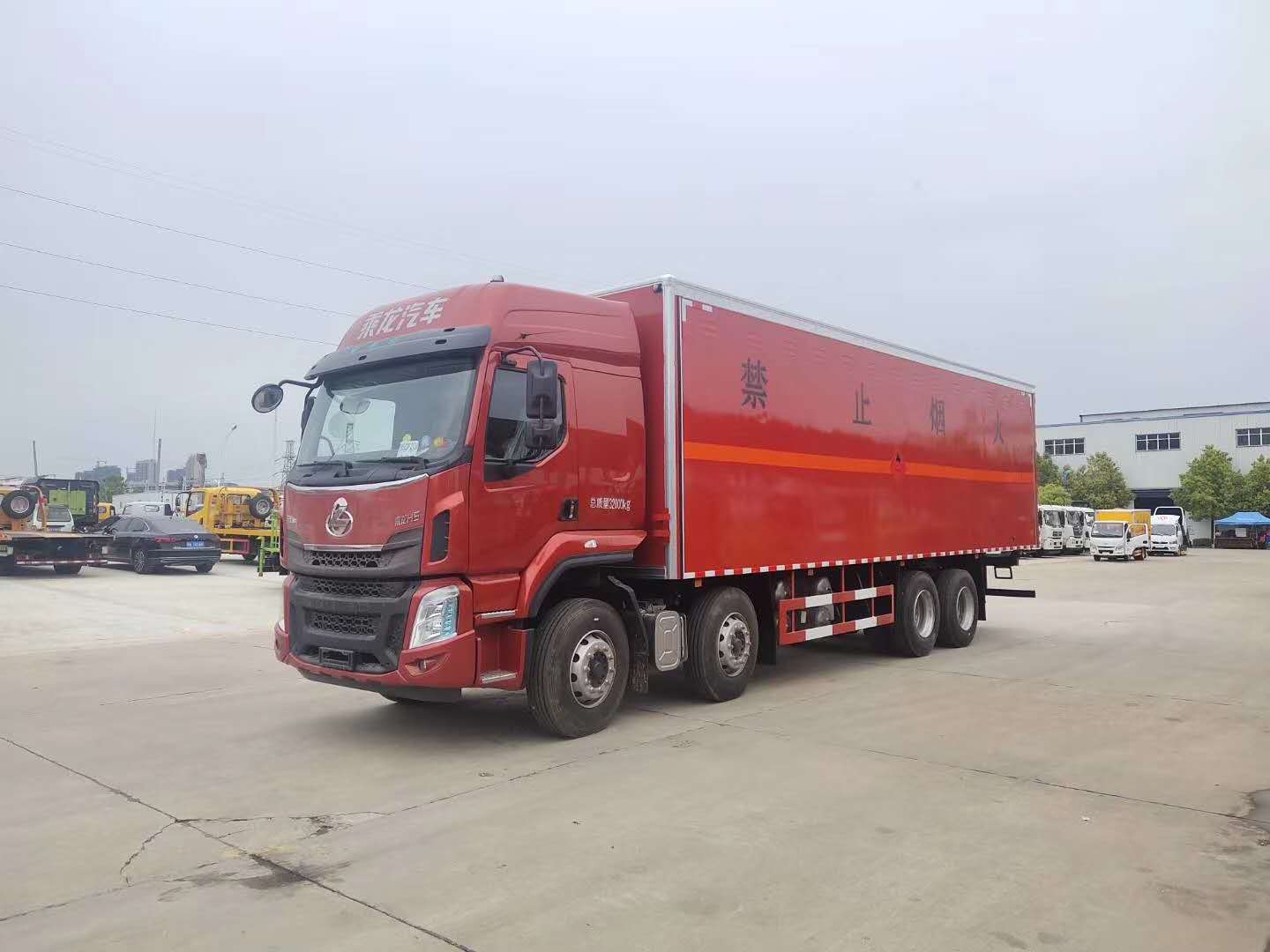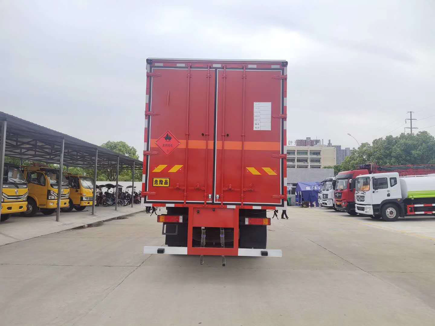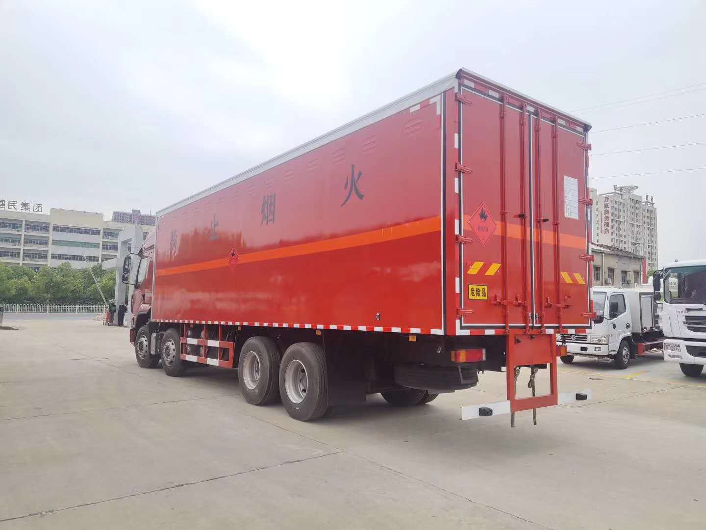 廂體配置:嚴格按照公告尺寸制作,外板采用1mm厚冷軋板有一次性成型的百葉窗,內飾為導電性能良好的鋁板有透氣孔,內襯為矩形管骨架牢靠穩(wěn)定,內部填充為透氣防潮阻燃的擠塑板,四種材料經現代工藝復合而成,廂體外部上下鋁合金型材包邊,底板和車廂前下部鋪橡膠皮,后門雙開,右側中部兩個雙開門,內部有固定貨物的臥環(huán),車輛外部有靜電帶、滅火器、防火罩,車廂內安裝煙霧報警器和門防盜報警器,嚴格按照國家危險品相關法規(guī)張貼。