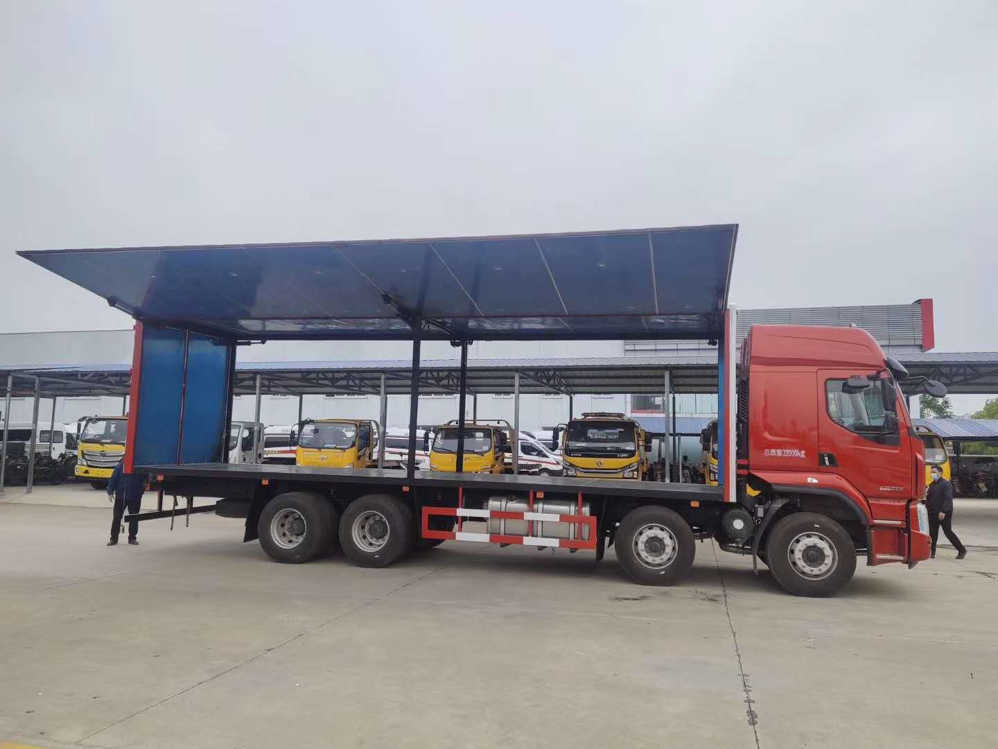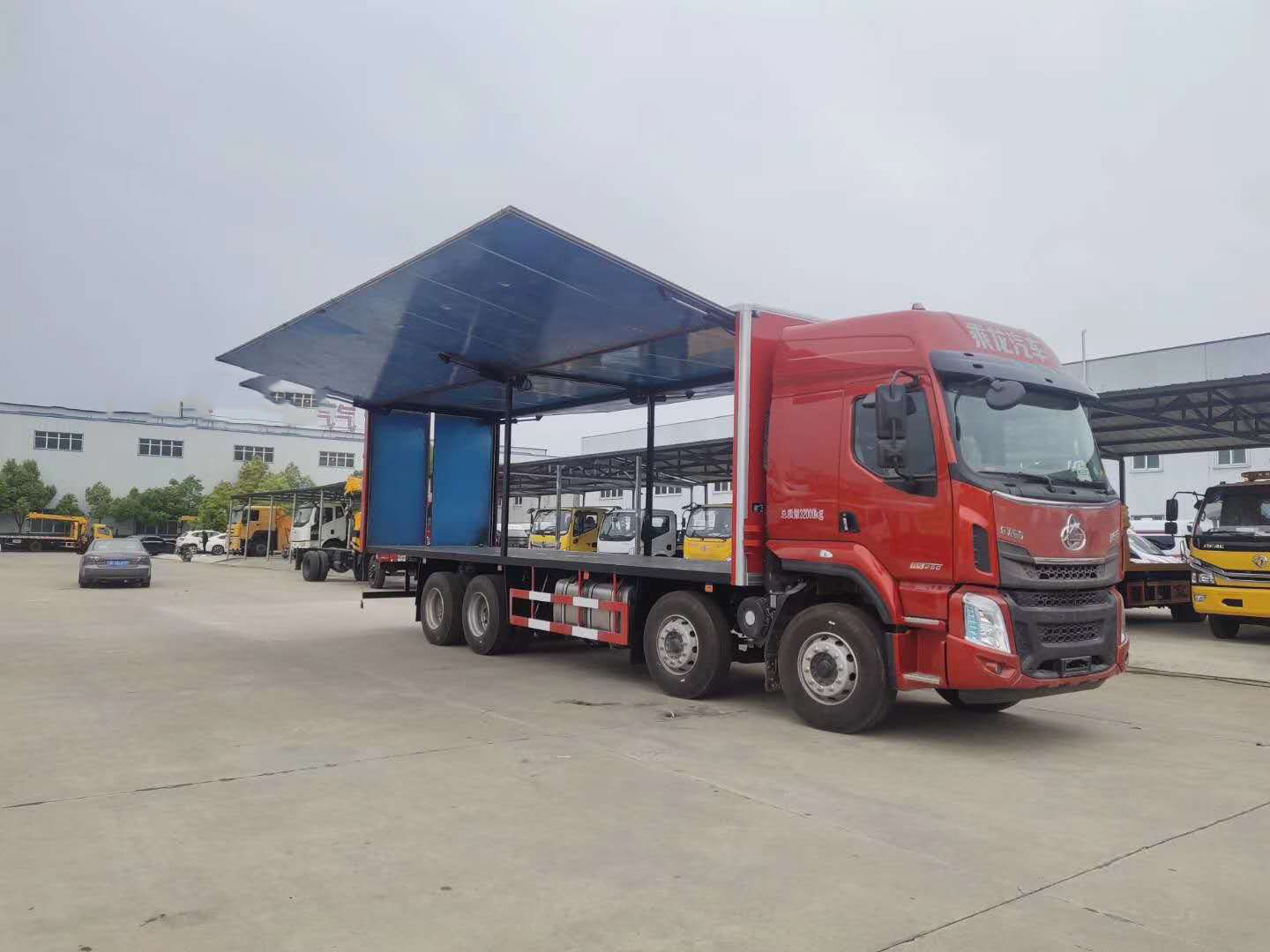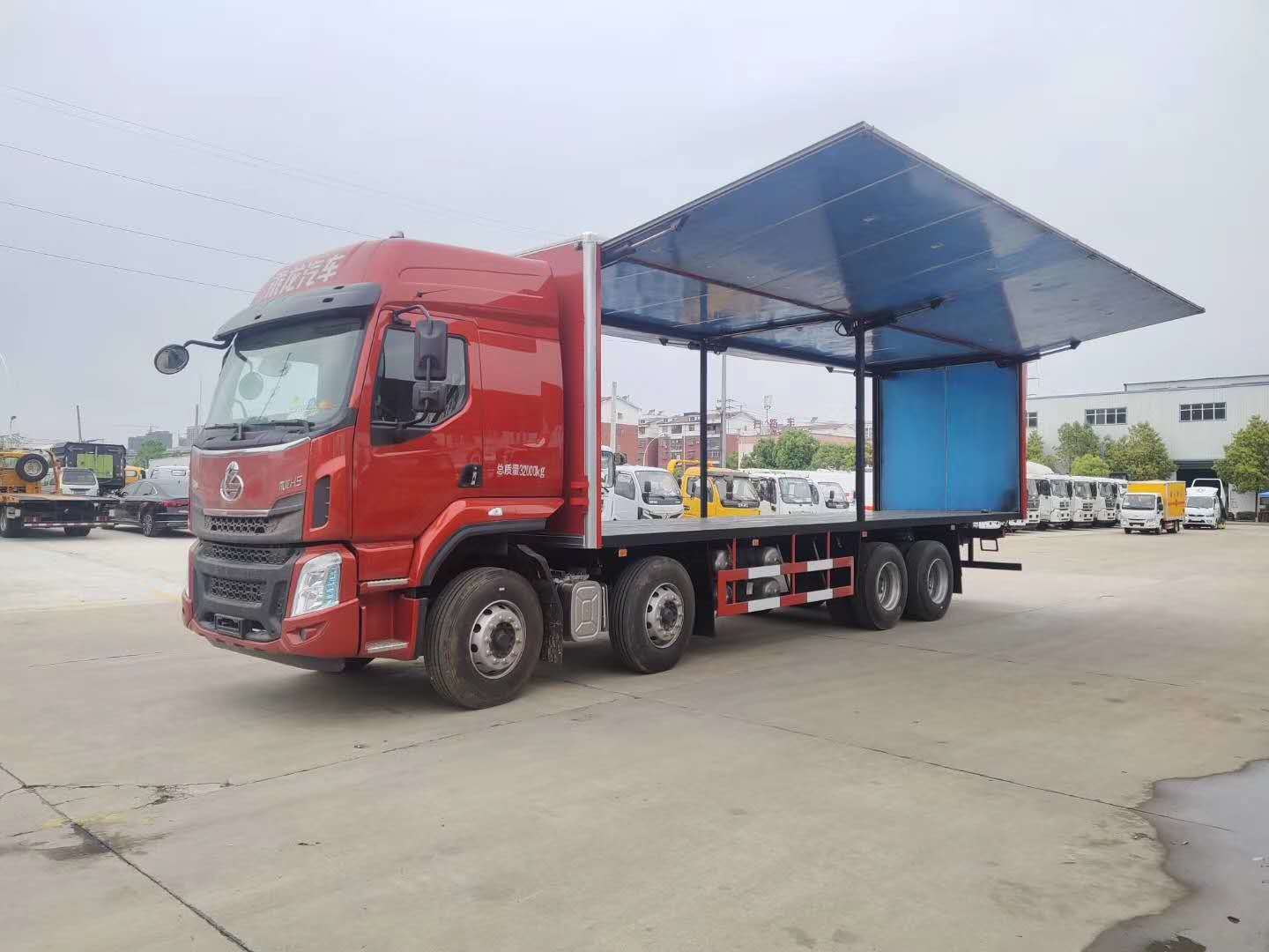 東風柳汽四軸易燃液體廂式車帶雙面翼展式,配6個液壓油缸。軸距1950+4100+1350mm,H57D駕駛室,YC6A290-50,9JS119TA,Ф430離合,FS160后橋/4.111,282(8)車架,600L鋁合金油箱,12R22.5,前機械后氣囊駕駛室懸置、電動液壓翻轉、夾層玻璃、電動玻璃升降器、氣囊減震司機座椅、鋁合金貯氣筒、LCD液晶儀表、MP3+收音機、空調、定速巡航系統(tǒng)、多態(tài)開關、電磁離合風扇、ABS、3/3/-/-后空懸、中控鎖、自動調整臂、車載終端(行駛記錄儀+兼容北斗GPS),盤式前橋,限速80km/h。