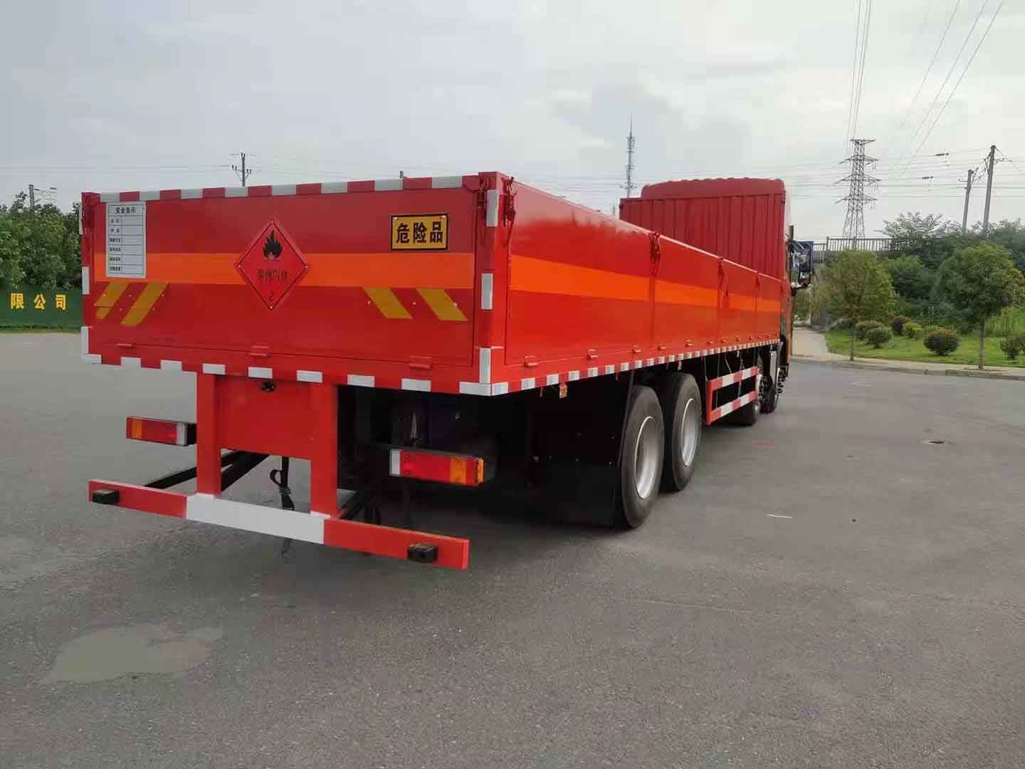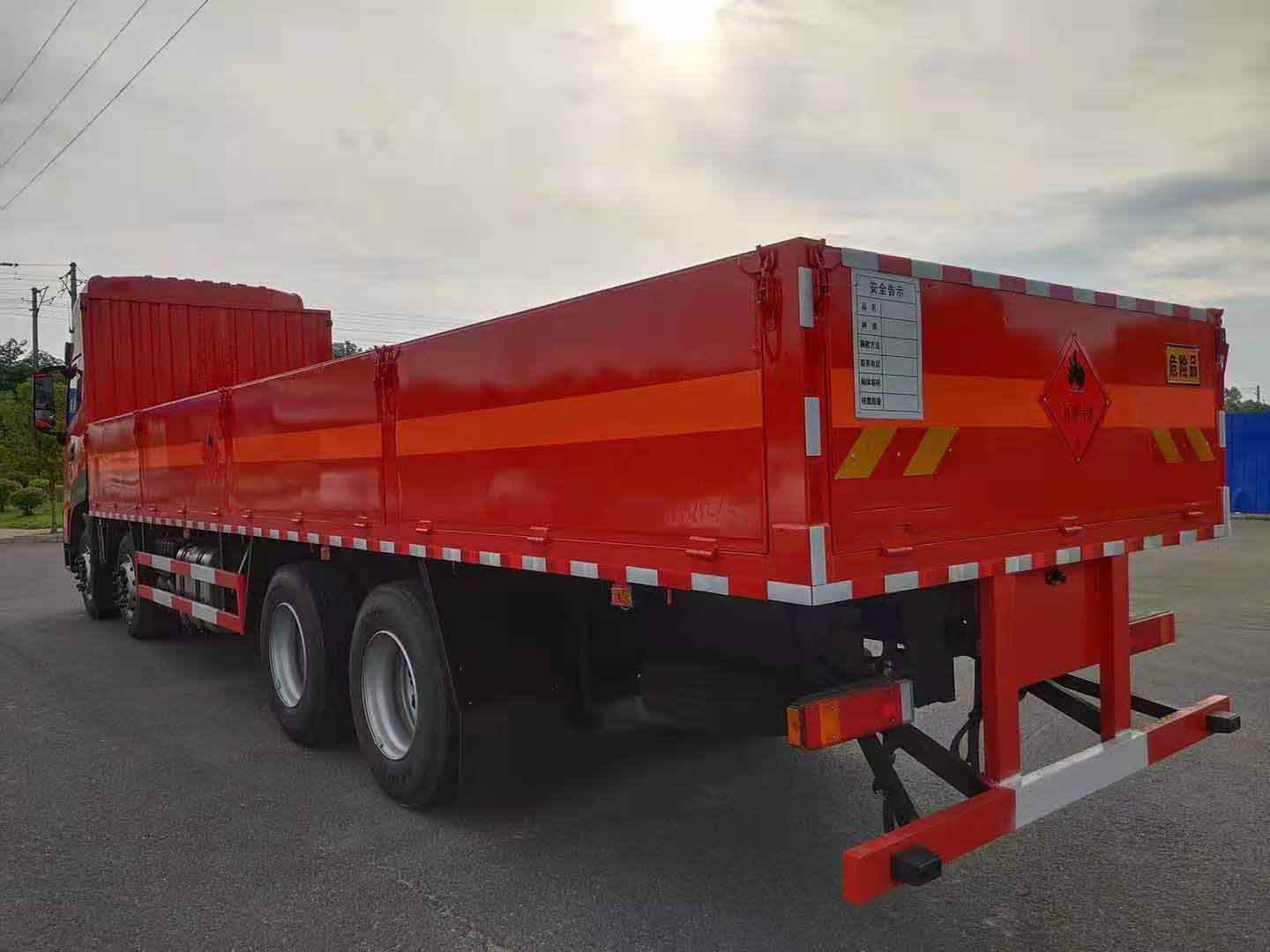 2)廂體配置:采用欄板車結(jié)構(gòu),外厚度為1.1毫米厚度武鋼冷軋鋼板,內(nèi)加強“幾”字型加強梁,車體底板加強處理并做防靜電處理。車體的左側(cè)、右側(cè),和后欄板栓鉤結(jié)構(gòu),可向下打開,方便上下貨物,車體為空曠式車型,大大減少了運輸物品因為狹窄空和強烈碰撞產(chǎn)生氣瓶爆炸的危險性,箱體外觀涂裝白色油漆,在欄板的中間位置粘貼橙色的;嚇藥В⒃谲圀w的左、右、后部粘貼“易燃氣體”或“不燃氣體”標識。駕駛室內(nèi)部配備兩只滅火器,后杠處安裝防追尾事故的緩沖固定塊。此款車輛屬于國家規(guī)定的危險品二類危險品運輸車。
