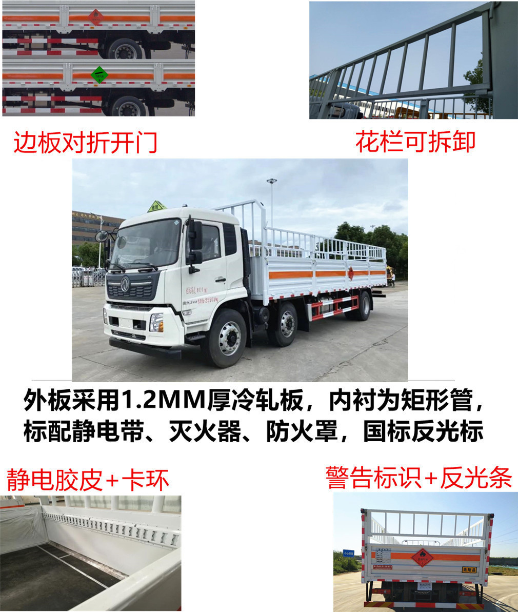 上裝配置:嚴(yán)格按照公告尺寸制作,邊2底4材質(zhì),底板上鋪靜電膠皮,側(cè)板平板內(nèi)置臥環(huán),側(cè)板上帶可卸式高欄,配備滅火器,三角頂燈,靜電拖帶等,嚴(yán)格按照國(guó)家危險(xiǎn)品法規(guī)進(jìn)行“易燃?xì)怏w”標(biāo)識(shí)粘貼等
